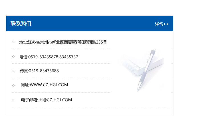 地址:常州市新北區友邦商務大廈1幢16、17層  電話:0519-85101652  傳真:0519-85112595  郵編:213022  網址:www.cz-jiayue_cn.jlrljt.com  郵箱:xiajifengaa@163.com